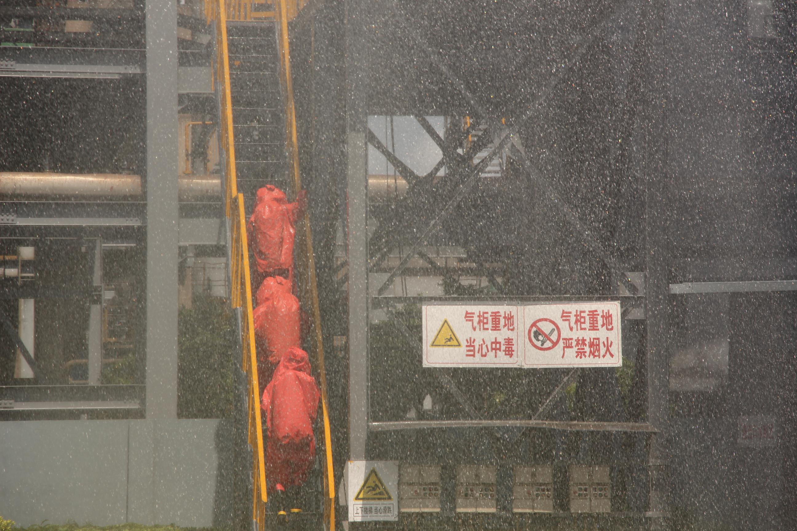 本次演練背景為廣西盛隆冶金有限公司兩名員工在對煤氣設(shè)備巡檢時,5萬噸煤氣罐煤氣設(shè)備發(fā)生泄漏事故,一人中毒,同時發(fā)生火災(zāi),5萬噸煤氣罐一旦發(fā)生爆炸后果不堪設(shè)想,盛隆公司立即將事故情況報告市應(yīng)急辦和市安監(jiān)局。經(jīng)過研判,市安委會啟動防城港市生產(chǎn)安全事故應(yīng)急救援預(yù)案,迅速成立事故應(yīng)急指揮部并發(fā)布一級應(yīng)急聯(lián)動程序,指揮火警119救火堵漏、120緊急救助傷員、氣象、環(huán)保等部門按照各自職責(zé)開展現(xiàn)場監(jiān)測。經(jīng)過各小組的密切配合,此次應(yīng)急救援演練順利完成。